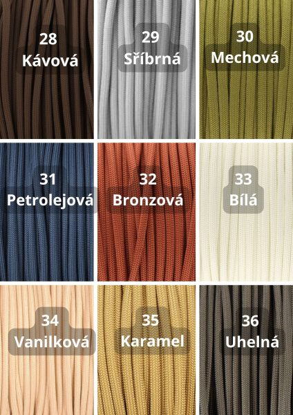 Paracord550: Materiál nabízený nejrůznějších barevných kombinacích, průměr jednoho lana je cca 4mm. Lano má 32 pramenů a 7 měkkých, kroucených jader. Lano je vyrobeno z Nylonu nebo Polyesteru. Tento typ je vhodný pro výrobu psích vodítek a obojků. minimální zatížení při přetržení je 249 Kg.