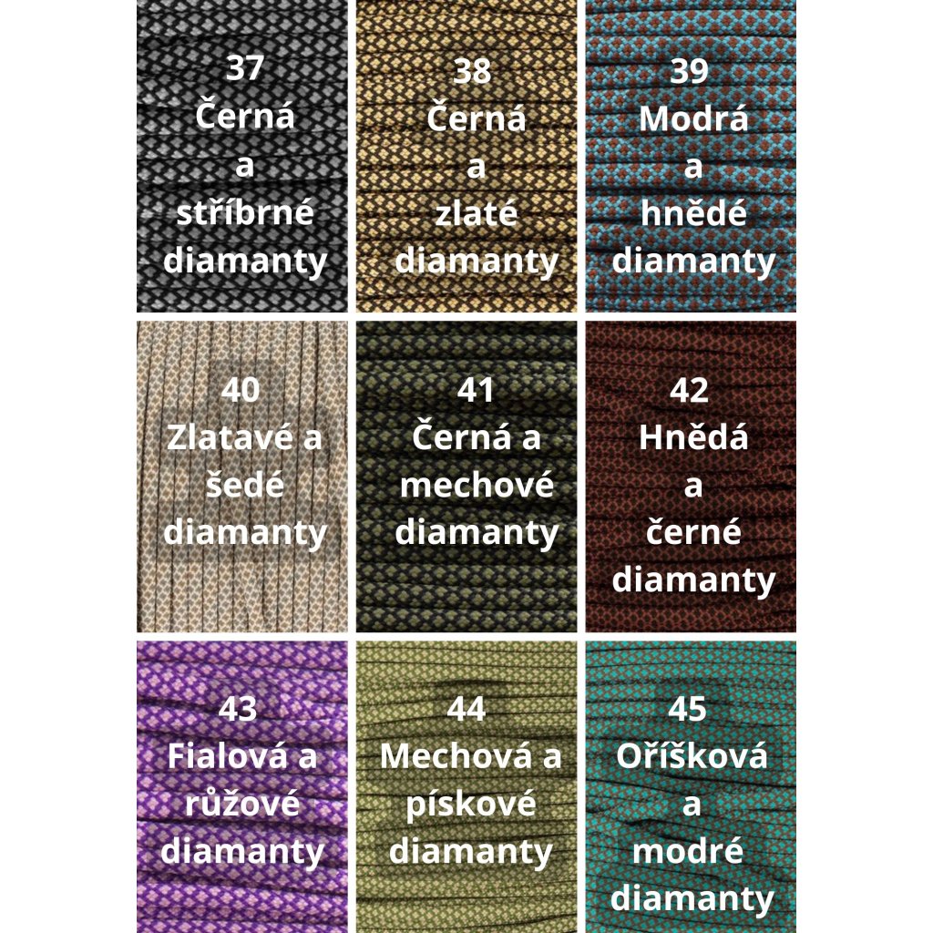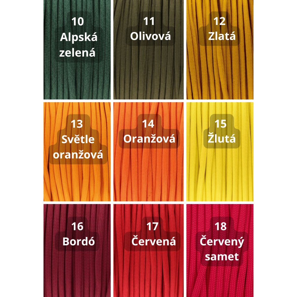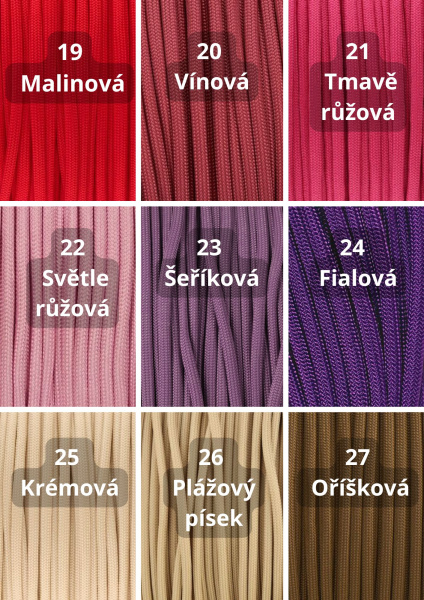 Paracord550: Materiál nabízený nejrůznějších barevných kombinacích, průměr jednoho lana je cca 4mm. Lano má 32 pramenů a 7 měkkých, kroucených jader. Lano je vyrobeno z Nylonu nebo Polyesteru. Tento typ je vhodný pro výrobu psích vodítek a obojků. minimální zatížení při přetržení je 249 Kg.