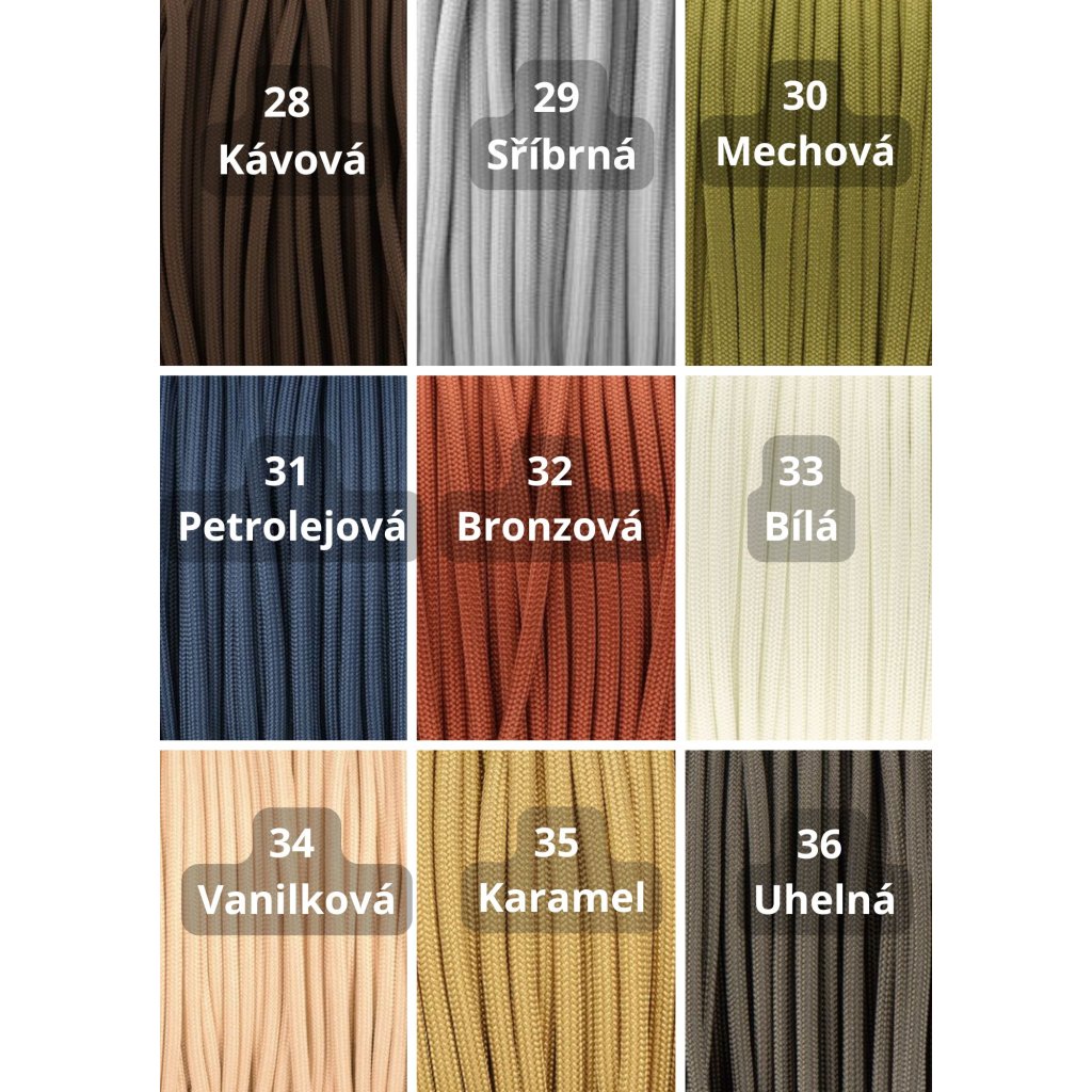 Paracord550: Materiál nabízený nejrůznějších barevných kombinacích, průměr jednoho lana je cca 4mm. Lano má 32 pramenů a 7 měkkých, kroucených jader. Lano je vyrobeno z Nylonu nebo Polyesteru. Tento typ je vhodný pro výrobu psích vodítek a obojků. minimální zatížení při přetržení je 249 Kg.