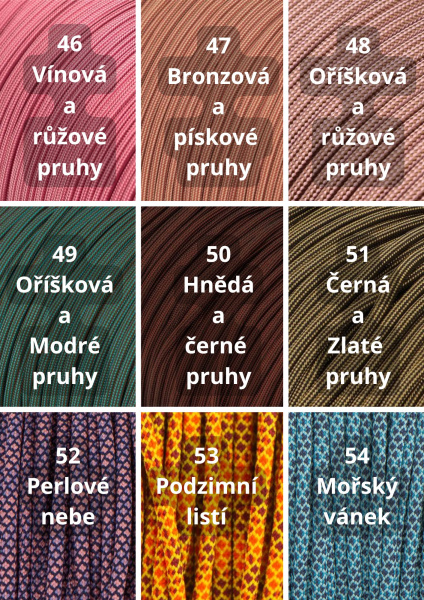 Paracord550: Materiál nabízený nejrůznějších barevných kombinacích, průměr jednoho lana je cca 4mm. Lano má 32 pramenů a 7 měkkých, kroucených jader. Lano je vyrobeno z Nylonu nebo Polyesteru. Tento typ je vhodný pro výrobu psích vodítek a obojků. minimální zatížení při přetržení je 249 Kg.