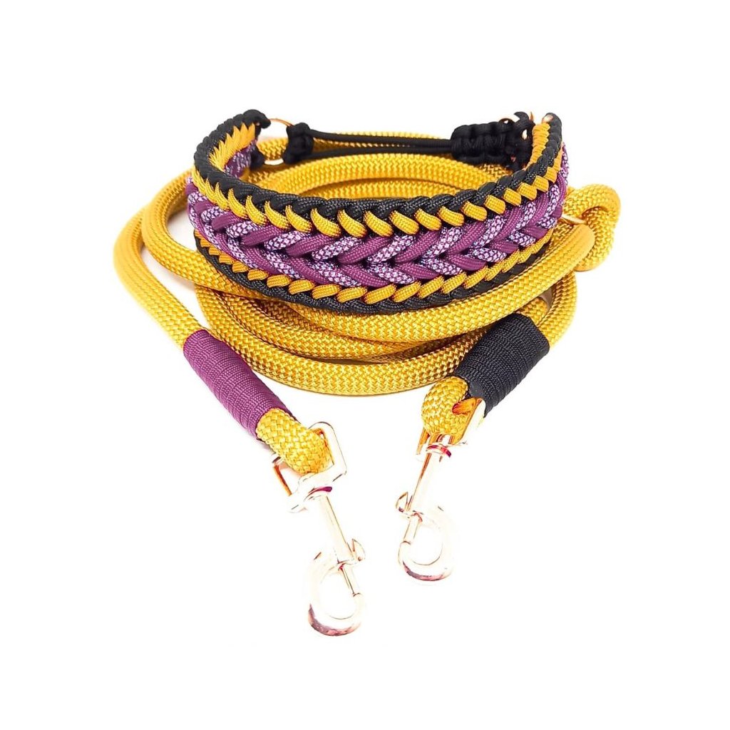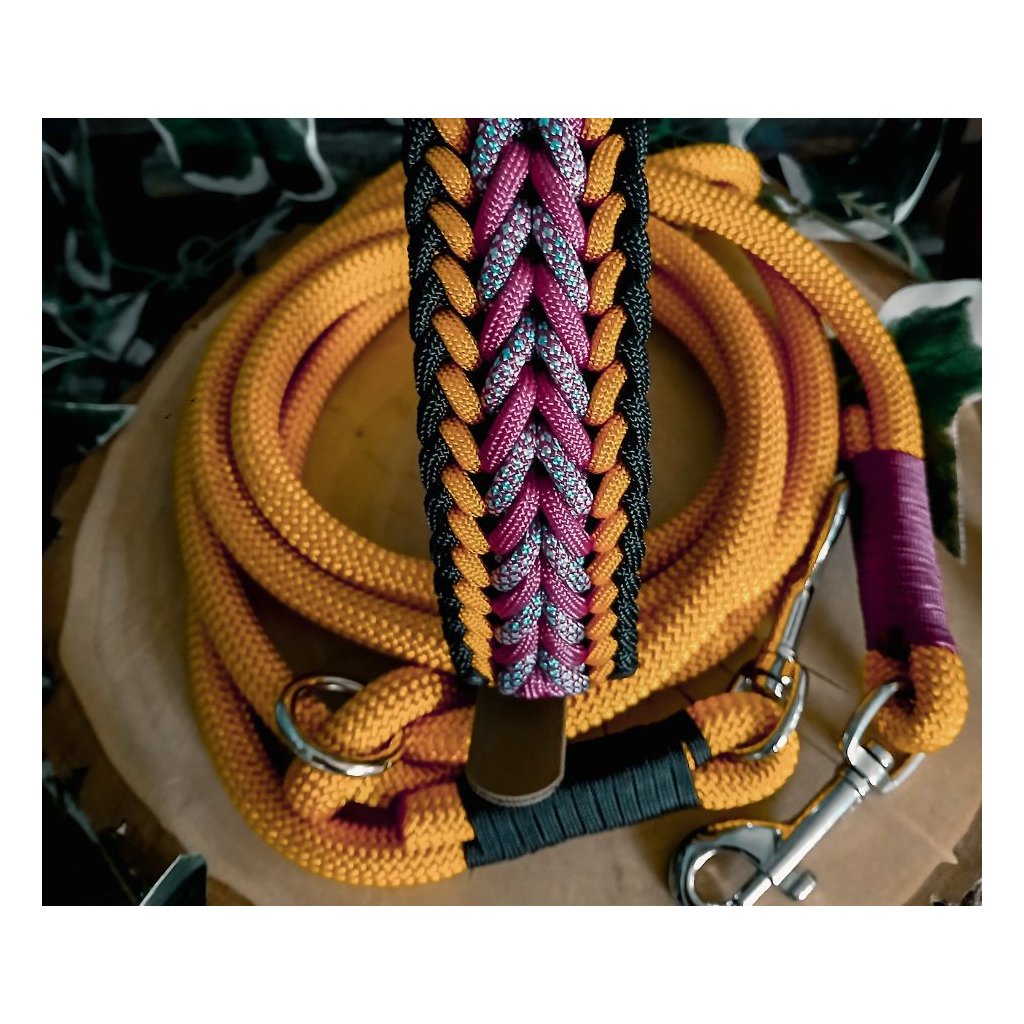 Paracord550: Materiál nabízený nejrůznějších barevných kombinacích, průměr jednoho lana je cca 4mm. Lano má 32 pramenů a 7 měkkých, kroucených jader. Lano je vyrobeno z Nylonu nebo Polyesteru. Tento typ je vhodný pro výrobu psích vodítek a obojků. minimální zatížení při přetržení je 249 Kg.